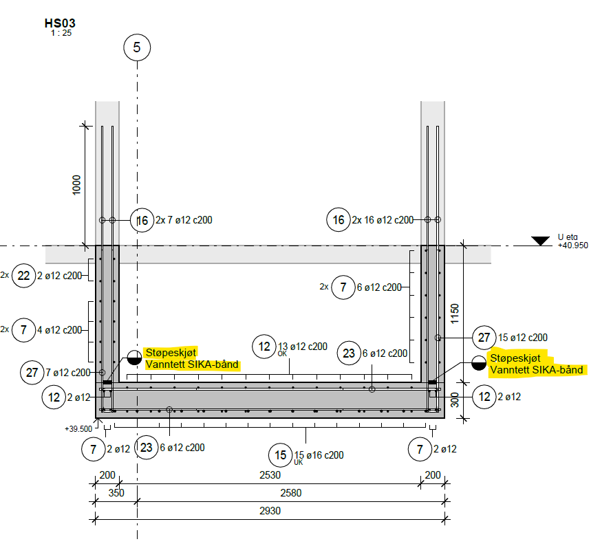 Heisgrop sikres mot vanninntrengning med fugebånd og injeksjonsslanger.